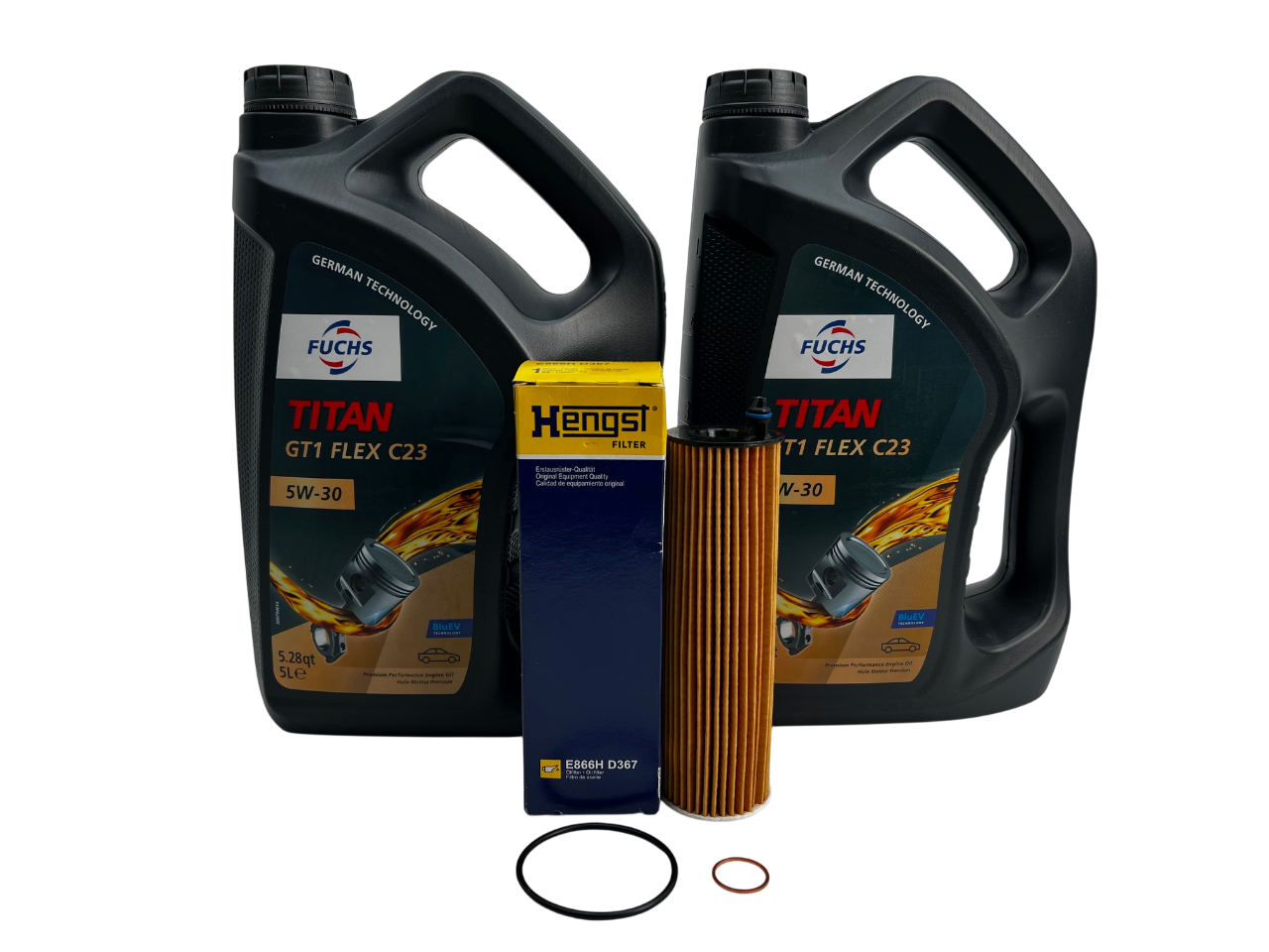 Includes OEM Hengst oil filter with drain plug seal ring along with 13 liters of Fuchs 5W-30 engine oil.