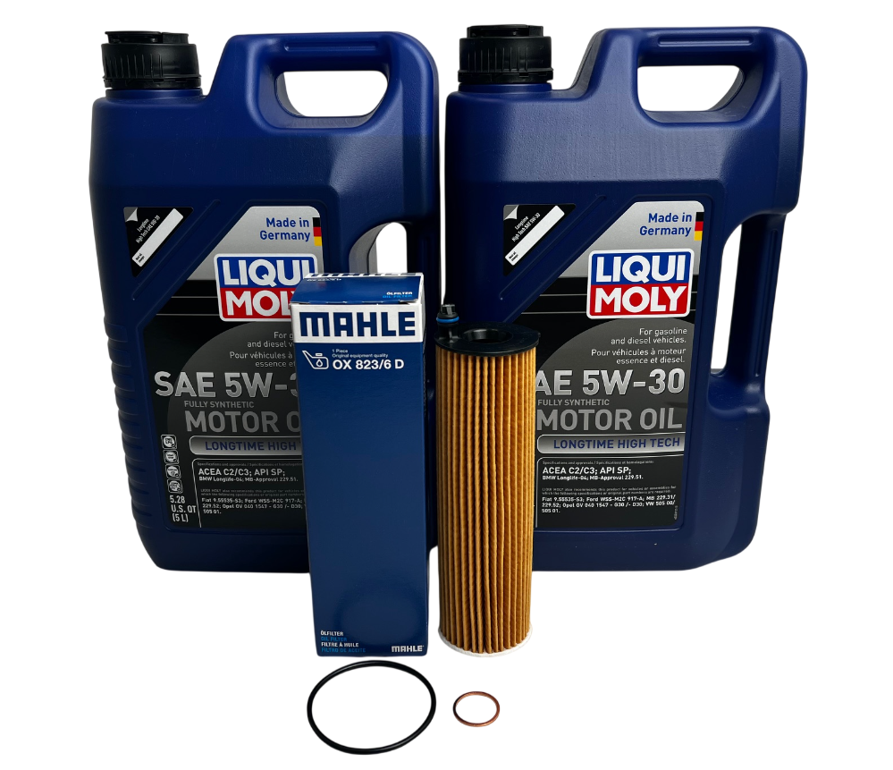 Includes Hengst oil filter, 12 Liters of Liqui Moly 5W30 and drain plug seal ring.
