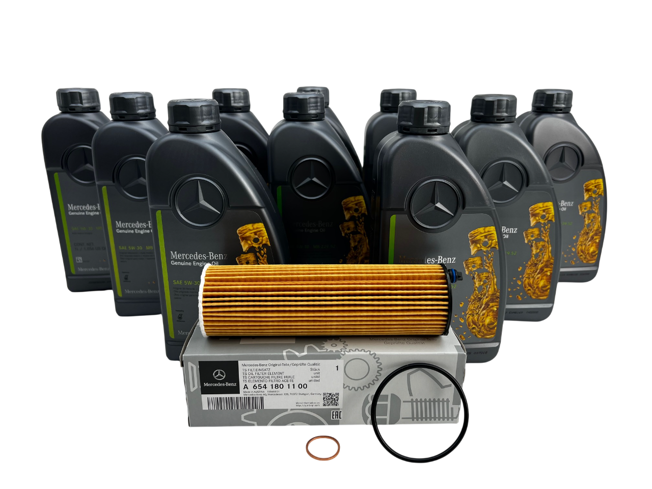 Oil filter, 12 Liters of Genuine Mercedes 5W30 engine oil and copper drain plug seal ring.