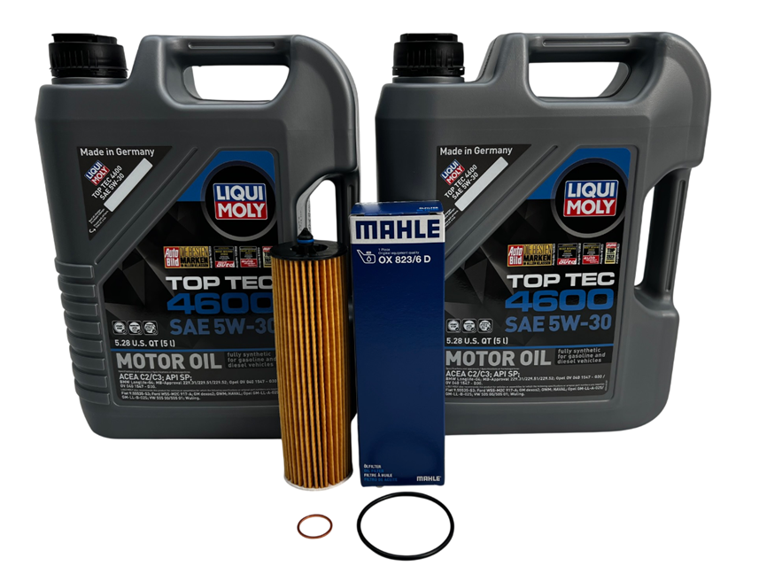 Includes Hengst oil filter, 12 Liters of Liqui Moly Top Tech 4600 5W30 and drain plug seal ring.